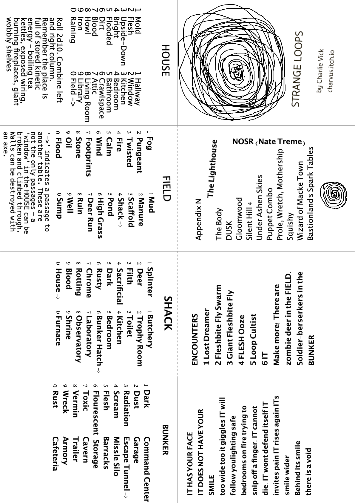 (Un)Level. 3d6 in order stats, no indication what they're for, you get saving throws, you are level 3 forever, you get 3dx HP + the length of one of the words you used to describe your class/background. This is very cool in its brevity. Things aren't dictated or even hinted at. I'd steal a lot of stuff from Delving Deeper and Liminal Horror and run this like a stolen car.